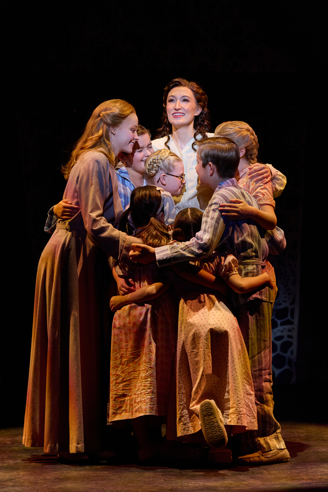 Kevin Earley (Captain Georg von Trapp) and Cayleigh Capaldi (Maria Rainer) with the von Trapp Children (l to r) Ariana Ferch (Liesl), Eli Vander Griend (Friedrich), Ava Davis (Louisa), Benjamin Stasiek (Kurt), Haddie Mac (Brigitta), Ruby Caramore (Marta), Luciana VanDette (Gretl) in The Sound of Music.